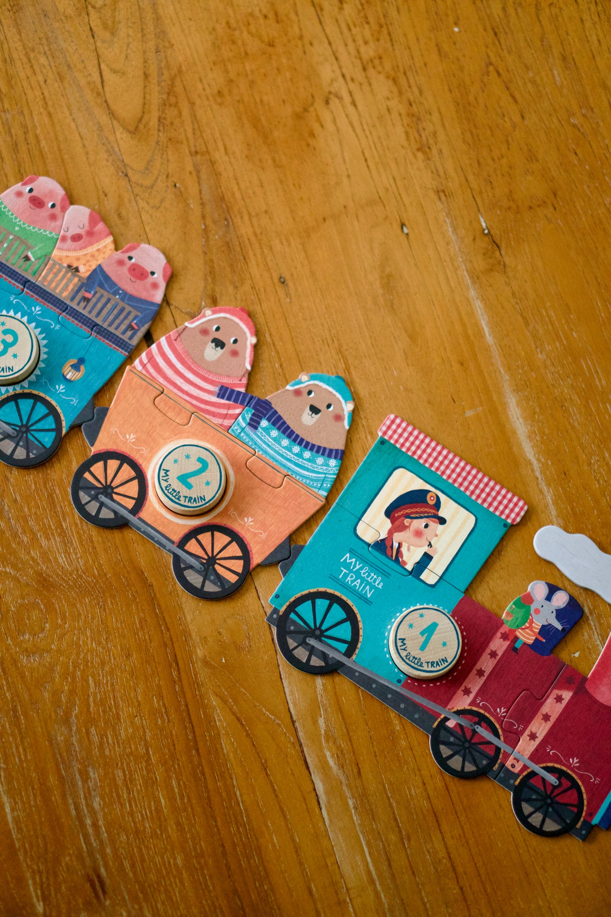 Puzzel alle tien de puzzels tot een trein en leg de houten cijfers in een locomotief. Heel leuke introductie tot het leren tellen gecombineerd met verbeelding!