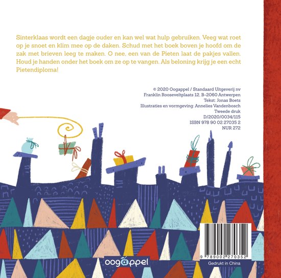 Sinterklaas wordt een dagje ouder en kan wel wat hulp gebruiken. Veeg wat roet op je snoet en klim mee op de daken. Schud met het boek boven je hoofd om de zak met brieven leeg te maken. Oh nee! Een van de pieten laat de pakjes vallen. Hou je handen onder het boek om ze op te vangen. Als beloning krijg je een echt Pietendiploma.