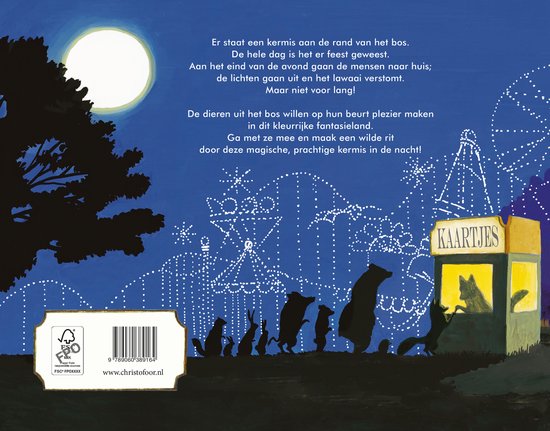 Er staat een kermis aan de rand van het bos. De hele dag is het er feest geweest. Aan het eind van de avond gaan de mensen naar huis; de lichten gaan uit en het lawaai verstomt. Maar niet voor lang! De dieren uit het bos willen op hun beurt nu plezier maken. Een dappere wasbeer trekt aan een hendel en … alle lampen springen aan, de achtbaan gaat weer rollen en de dieren nemen bezit van de attracties. Ga met ze mee en maak een wilde rit door deze magische, prachtige kermis in de nacht!