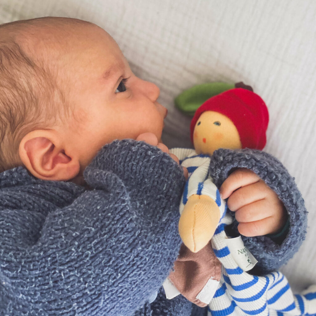 Heel leuk om als kraamcadeautje te geven aan een kersvers babytje. Het hoofdje is gevuld met schapenwol waardoor de vertrouwde geur van het kindje snel in het popje wordt opgenomen.