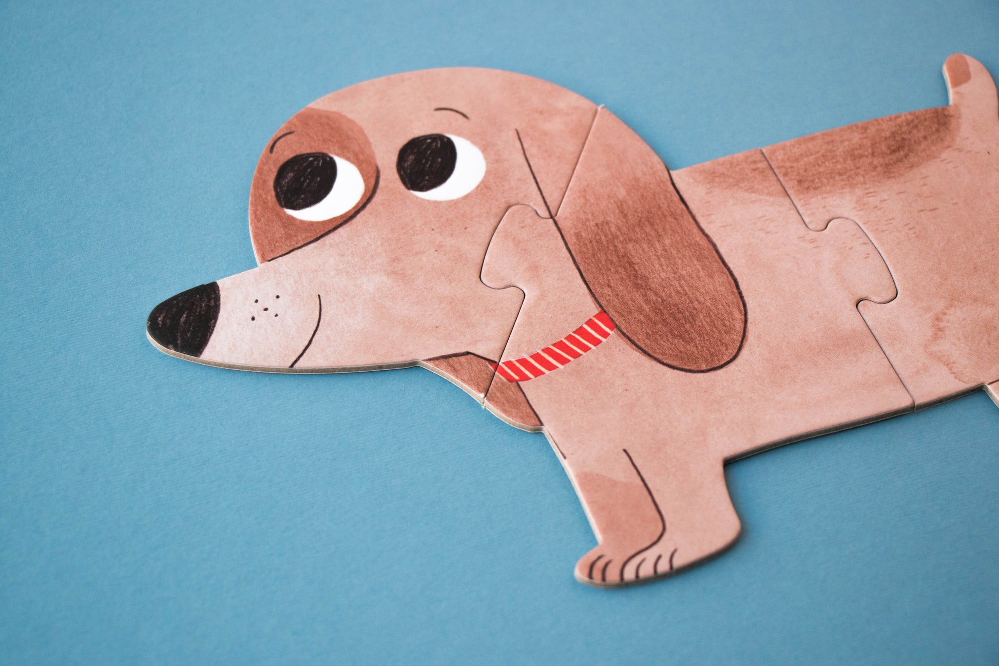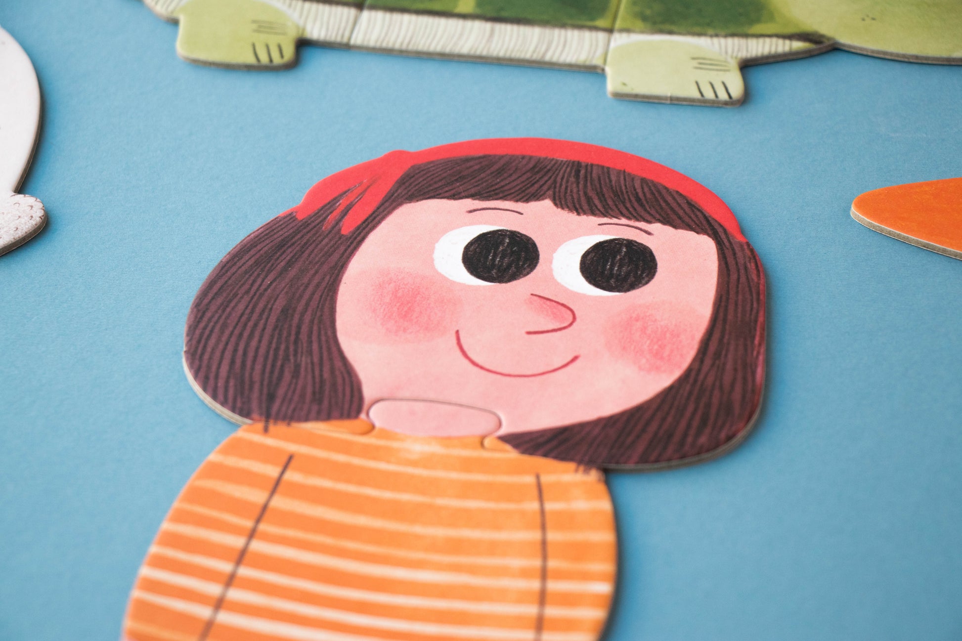 In de doos vind je 7 puzzels, 6 dieren en één meisje.