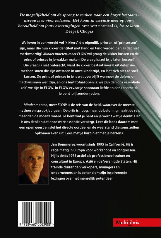 We leven in een wereld vol 'kikkers', die eigenlijk 'prinsen' of 'prinsessen' zijn, maar die hun kikkeridentiteit met hand en tand verdedigen. Is dat niet merkwaardig? Minder moeten, meer FLOW wil graag de kikker kussen en de prins of prinses in je wakker maken. De vraag is: zul je je laten kussen? Die vraag is niet onterecht, want de kikker bestaat vooral uit defensiemechanismen die zijn ontstaan in onze kindertijd, en laat zich niet zo snel kussen. De prins of prinses in je is wat overblijft wanneer de defensiemechanismen weg zijn, en ons hart totaal open is: we zijn dan ons essentiële zelf: we zijn in FLOW.