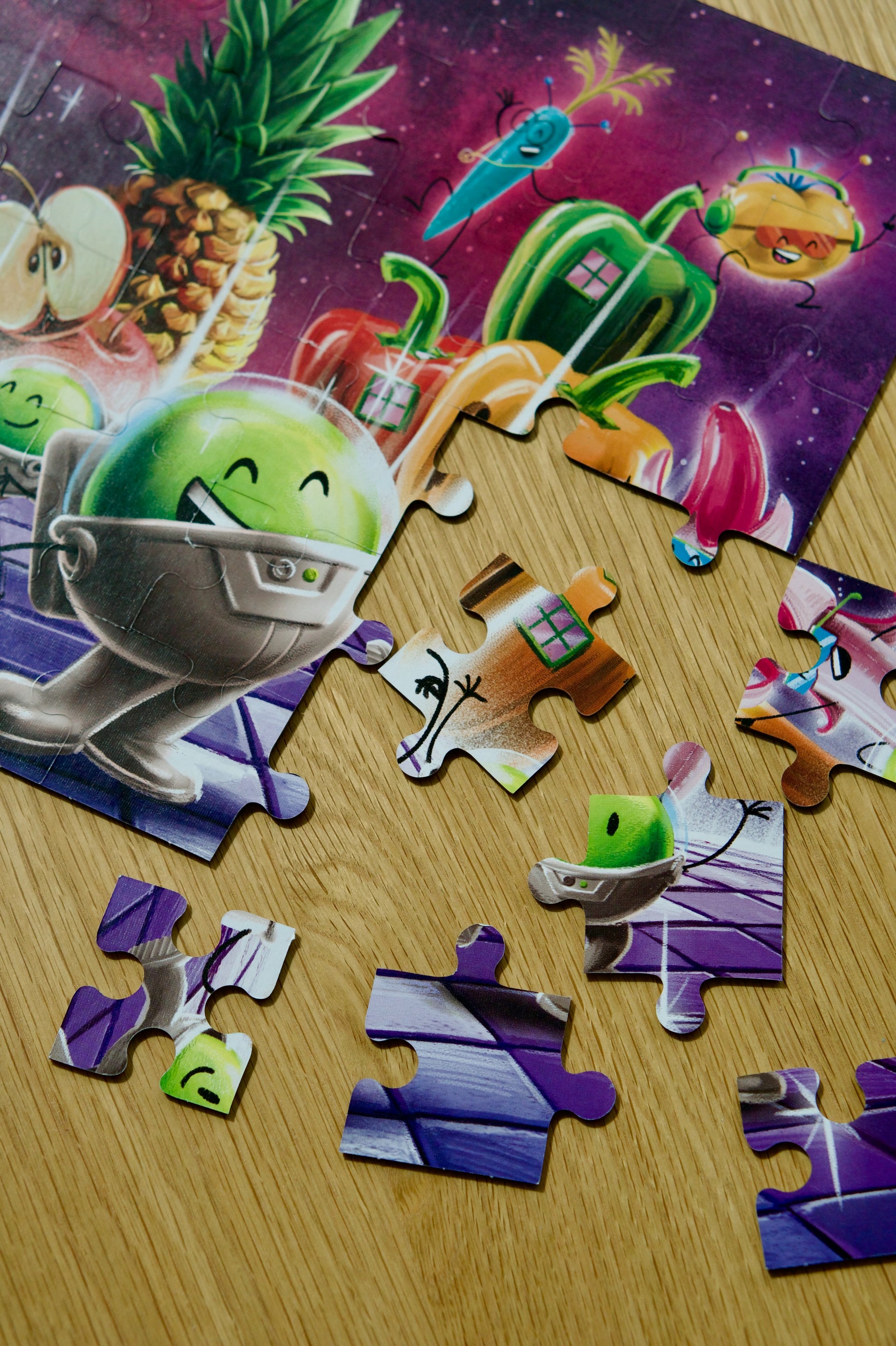 Vervolledig beide kanten van de omkeerbare puzzel. Stap aan boord van de peulraket en vlieg mee op een dolkosmisch avontuur.