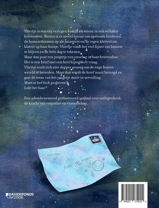 Maar dan post een jongetje een envelop in haar brievenbus. Het is een brief met een heel bijzondere vraag. Vliertje voelt zich niet dapper genoeg om de enge buitenwereld te betreden. Maar dan wordt de brief nooit bezorgd en gaat de wens van het jongetje nooit in vervulling. Moet ze het toch proberen? Lukt het haar?