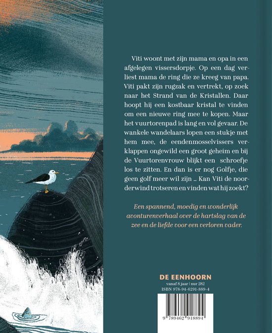 Viti woont met zijn mama en opa in een afgelegen vissersdorpje. Op een dag verliest mama de ring die ze kreeg van papa. Viti pakt zijn rugzak en vertrekt, op zoek naar het Strand van Kristallen. Daar hoopt hij een kostbaar kristal te vinden om een nieuwe ring mee te kopen. Maar het vuurtorenpad is lang en vol gevaar. De wankele wandelaars lopen een stukje met hem mee, de eendenmosselvissers verklappen ongewild een groot geheim en bij de Vuurtorenvrouw blijkt een schroefje los te zitten. En dan is er nog Golfje, die geen golf meer wil zijn … Kan Viti de noorderwind trotseren en vinden wat hij zoekt?