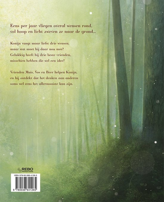 Eens per jaar vliegen overal wensen rond, vol hoop en licht zweven ze naar de grond... Konijn vangt maar liefst drie wensen, maar wat moet hij daar nou mee? Gelukkig heeft hij drie beste vrienden, misschien hebben die wel een idee? Vrienden Muis, Vos en Beer helpen Konijn, en hij ontdekt dat het denken aan andere soms wel eens het allermooiste kan zijn.